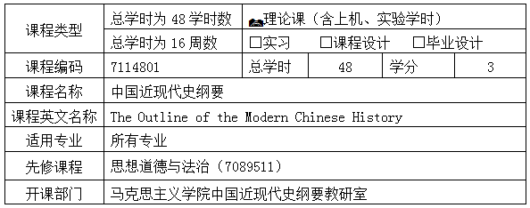 本课程为必修的思想政理论课。本课程为学生了解近代中国的国情奠定历史学基础,目的是让学生熟悉近现代中国的演变历程,掌握历史人物、历史事件的评价方法,了解中国人民反抗外国侵略,推翻“三座”大山,实现民族独立,人民解放,国家繁荣富强,人民共同富裕的历史,培养学生鉴往知来、知史爱国的能力。