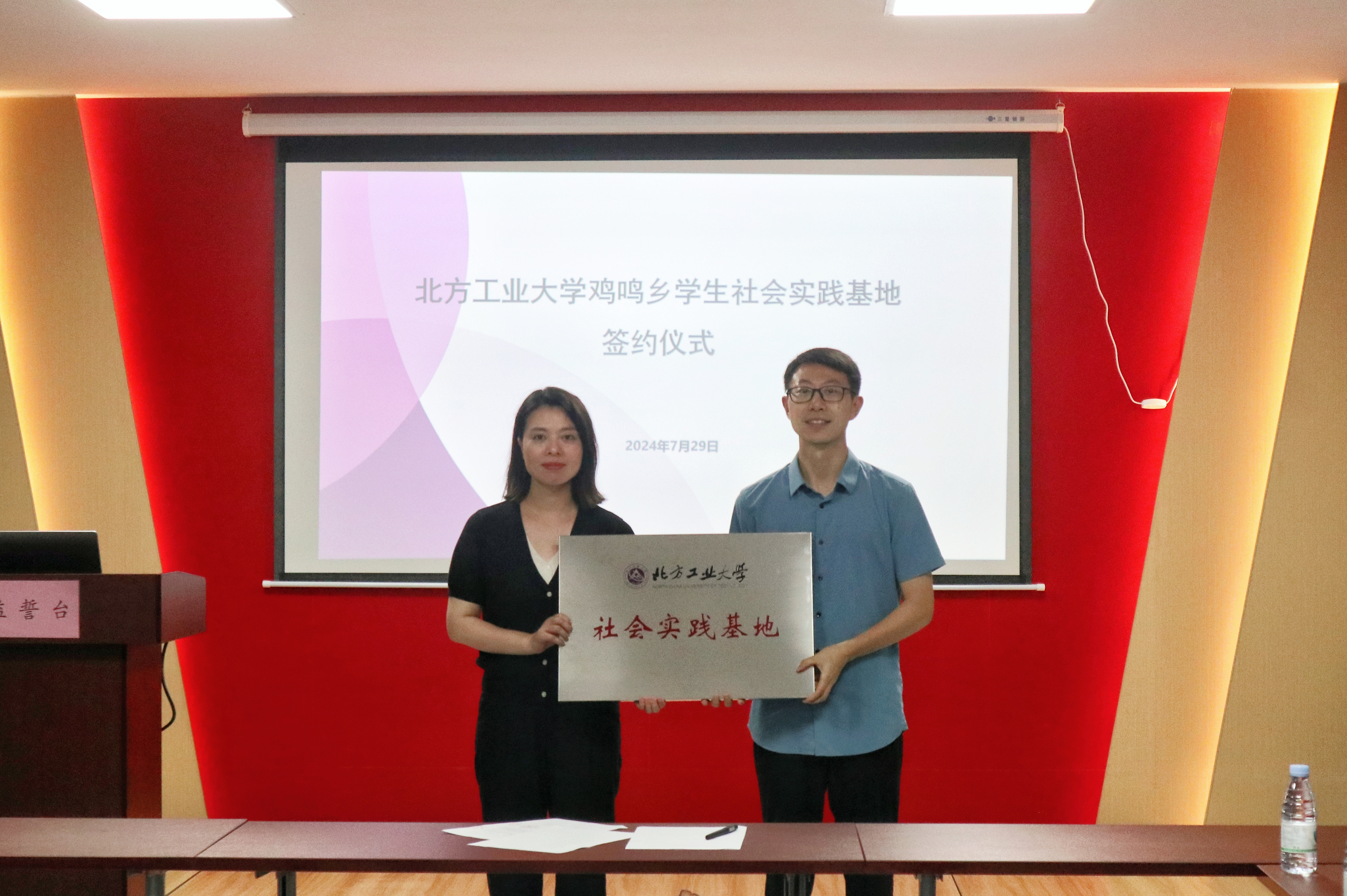 实践团与鸡鸣乡政府达成共识,携手共建社会实践基地,于7月29日举行了挂牌仪式。鸡鸣乡党委书记姜涛表示将以此次共建为契机,持续加强双方的合作交流,实现优势互补、资源共享,以基地共建引领共同发展。实践团指导老师闻亮简要介绍了北方工业大学与实践团情况,表示校地共建学生社会实践基地将更好推动资源整合,期待与鸡鸣乡共同搭建更广阔的合作平台。