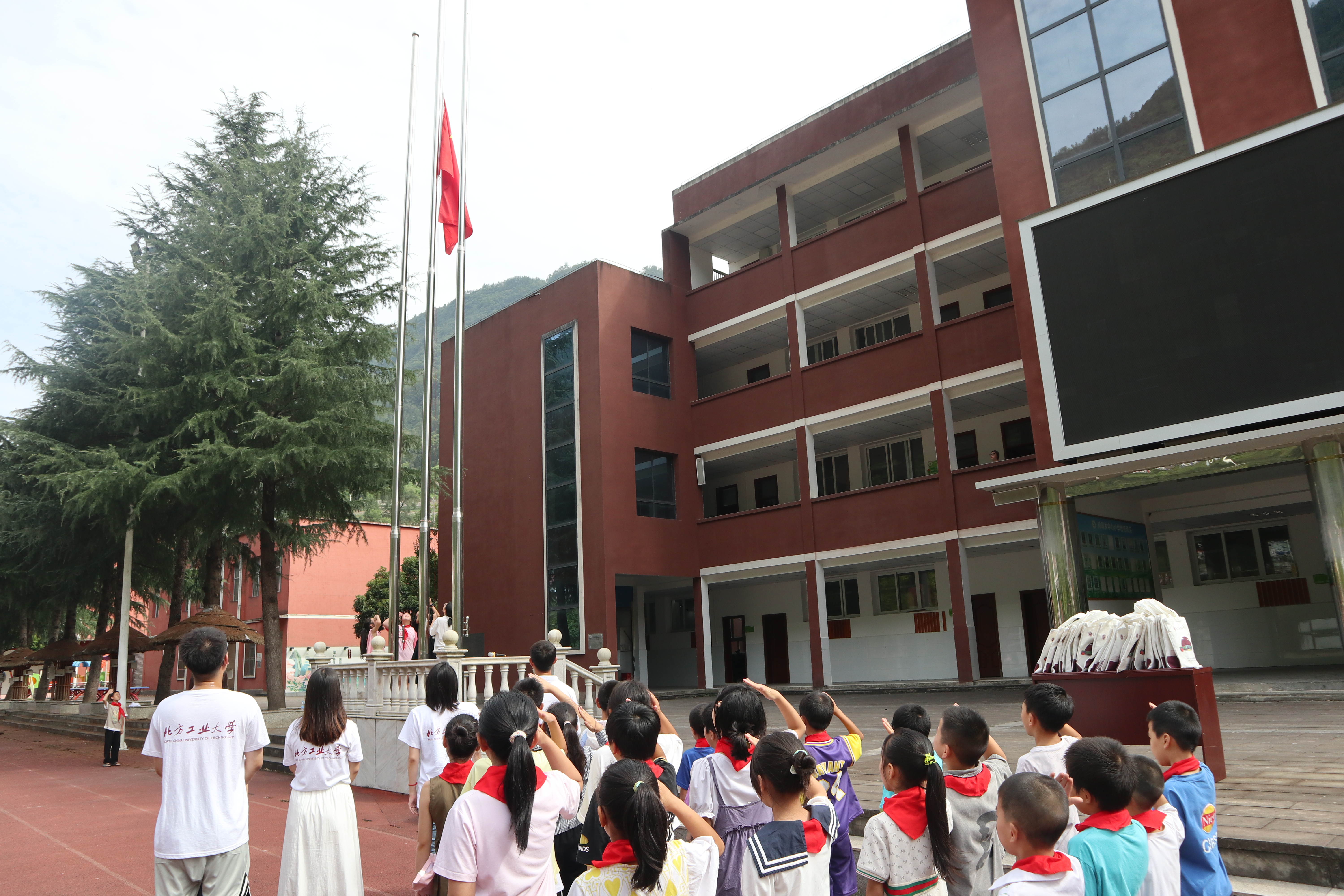 为进一步加强新时代青少年爱国主义主题教育,实践团来到鸡鸣乡中心小学开展了爱国主义教育系列活动。升旗仪式为本次主题教育活动拉开了序幕,随后实践团向学生代表赠送了学习礼包,希望他们能够努力学习,茁壮成长。