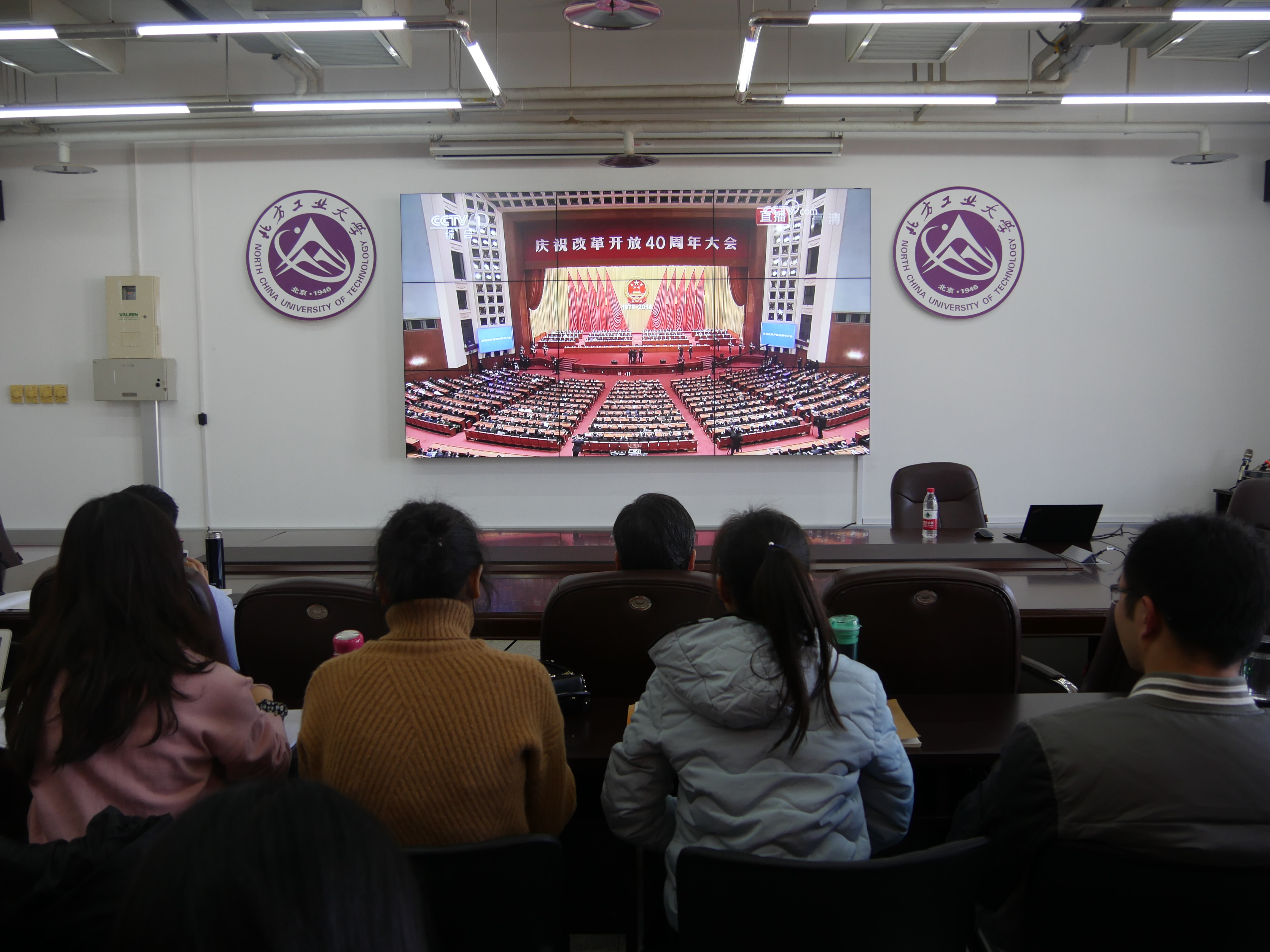 师生齐聚一堂,共同收看改革开放40周年庆祝大会。