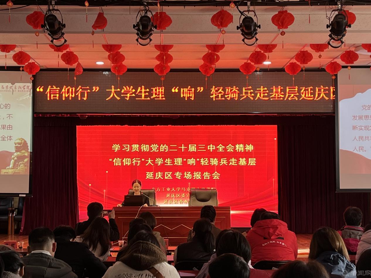 师生宣讲团一行赴延庆区,开展“信仰行”大学生理“响”轻骑兵走基层活动。师生们分别来到延庆镇、旧县镇和香水园街道,开展党的二十届三中全会精神专题宣讲。二百余名党员代表、群众代表参加报告会。宣讲活动受到当地党员群众的普遍好评。
