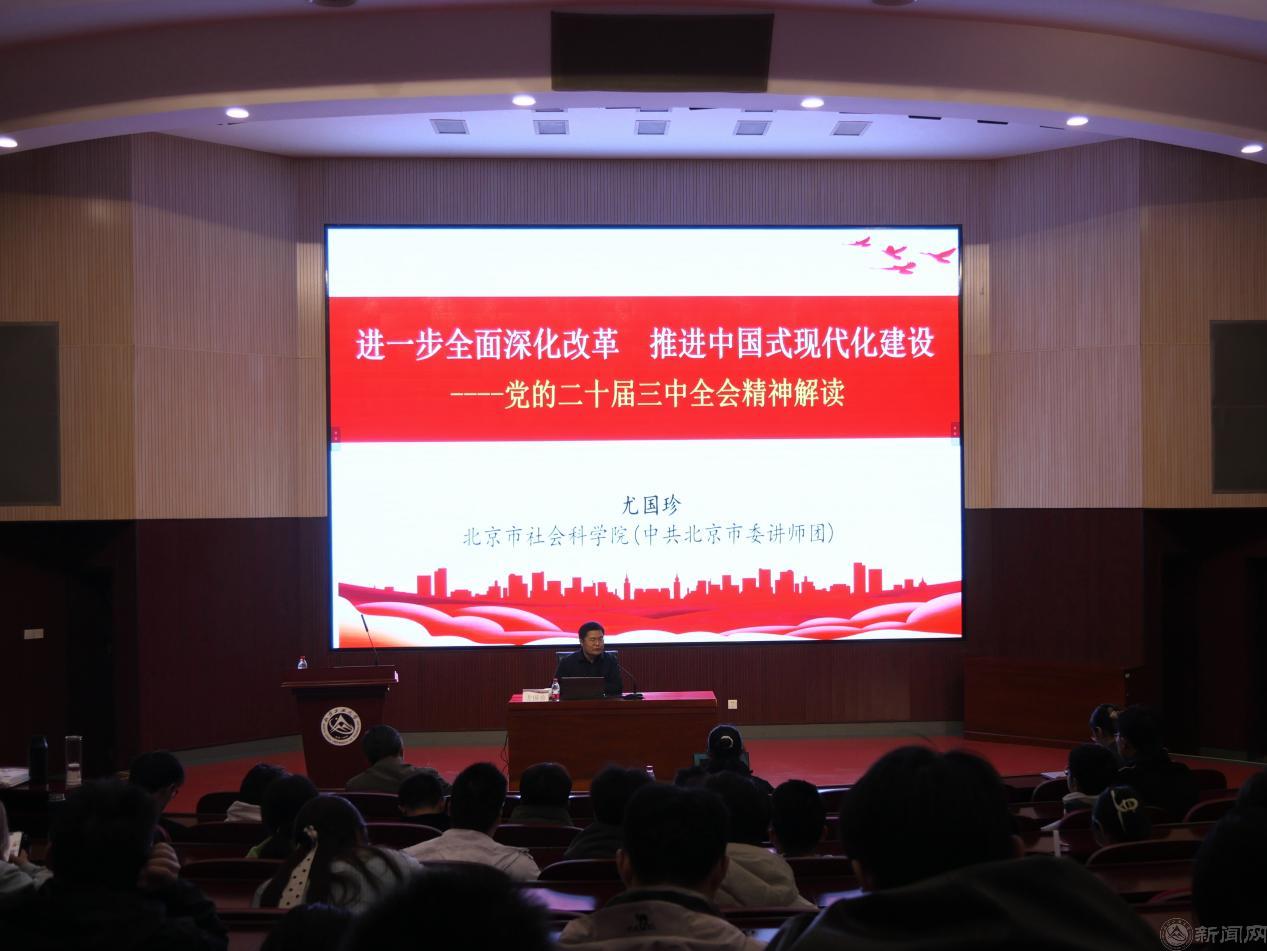 尤国珍教授以“进一步全面深化改革 推进中国式现代化建设”为主题,从深刻认识党的二十届三中全会召开的时代背景、全面准确理解《中共中央关于进一步全面深化改革、推进中国式现代化的决定》提出的重大举措、深入学习贯彻习近平总书记重要讲话精神等方面作了深入的宣讲辅导。报告既有政治理论高度,又有现实关照,对于广大师生深刻领会和把握党的二十届三中全会精神,以更加积极的姿态融入学校事业发展具有重要的指导意义。