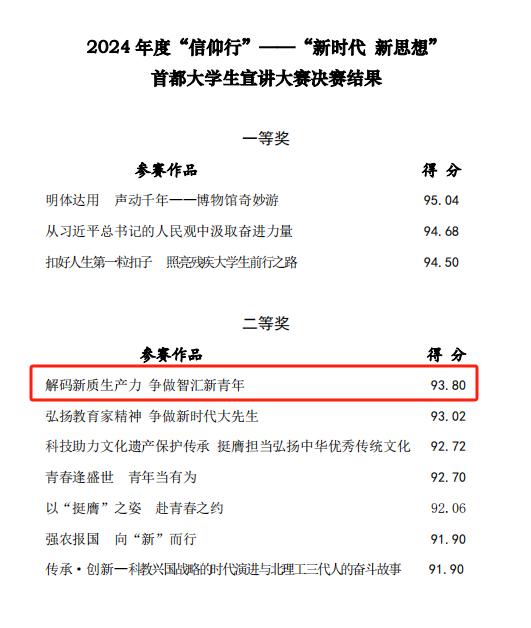 近日,北京市委宣传部、北京市委教工委、北京市社科院等单位联合举办“信仰行”——“新时代 新思想”首都大学生宣讲大赛决赛。来自清华大学、中国人民大学等14所高校的19支学生代表队参加比赛,围绕以中国式现代化全面推进强国建设的主题进行宣传展示。经过激烈角逐,我校代表队荣获二等奖。