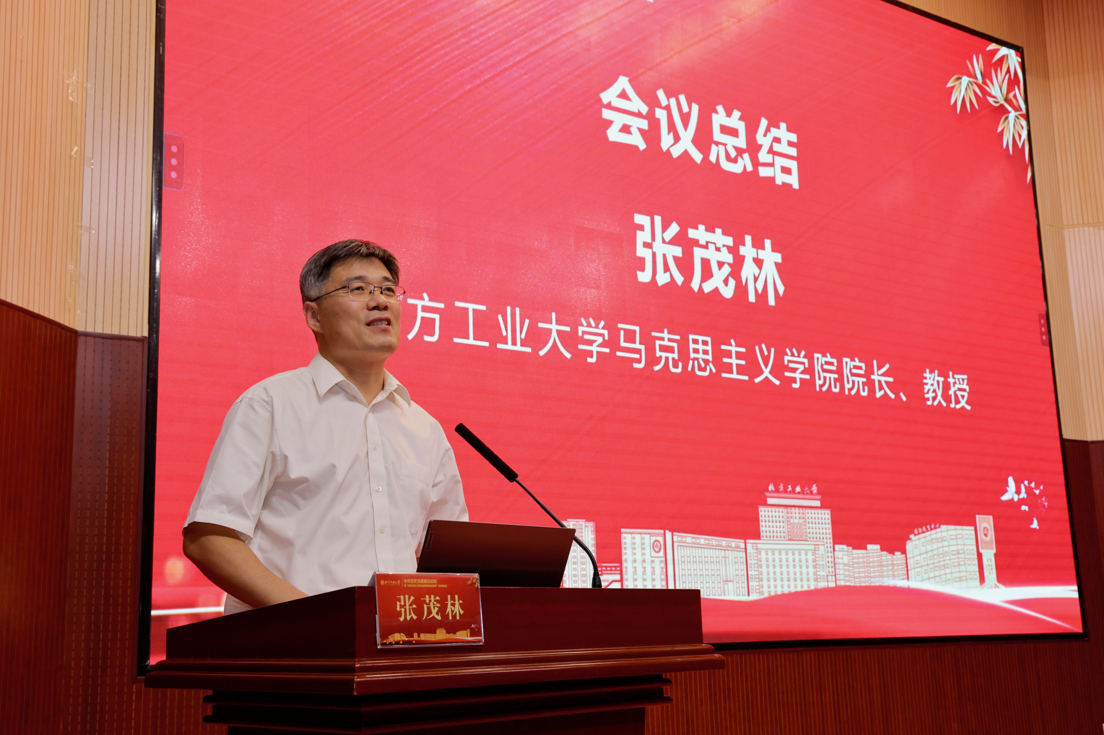 开幕式环节,北方工业大学党委副书记姜孔桥致辞。他指出,今年是中国人民抗日战争胜利80周年,本次研讨会以“中共党史党建前沿”与“抗战胜利80周年”为双主线,既是对历史的回顾,更是对新时代党史党建学科使命的践行。他强调,与会学者要以学术研究为纽带,深挖红色资源,讲好党的故事、革命的故事、英雄的故事,为培育时代新人、弘扬伟大抗战精神提供理论支撑。